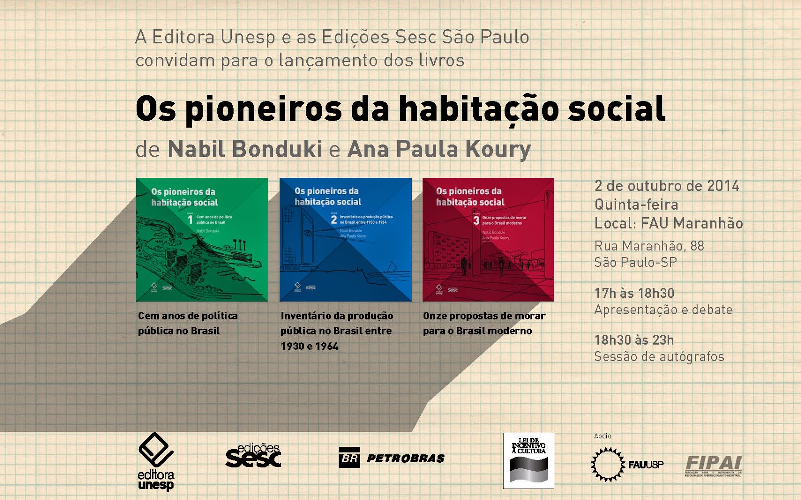 Lançamento da obra Pioneiros da habitação social2 de outubro de 201417h às 18h30 – Apresentação e debate18h30 às 23h – Sessão de autógrafosFAU Maranhão – Rua Maranhão, 88 – São PauloEntrada gratuita