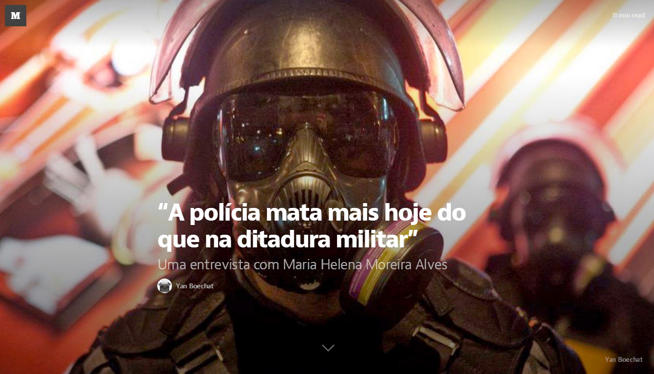 O repórter Yan Boechat, hoje na Istoé, entrevistou Maria Helena Moreira Alves há vários meses para um jornal diário, que terminou por não publicar a matéria. Feita sob o mote do lançamento de Vivendo no fogo cruzado, em 2013, a entrevista teria “envelhecido”, segundo o jargão jornalístico, e ficou descansando na gaveta. Na semana passada, após o aprofundamento da crise das UPPs e o caso da morte bárbara de Cláudia Silva Ferreira, baleada, transportada num porta-malas e arrastada por um carro de polícia num subúrbio carioca, ele decidiu publicar o texto, em seu blog, “mesmo sendo velho”: “Fiz questão de reforçar a data porque ocorreram fatos importantes depois, que acabei não tratando com ela”.